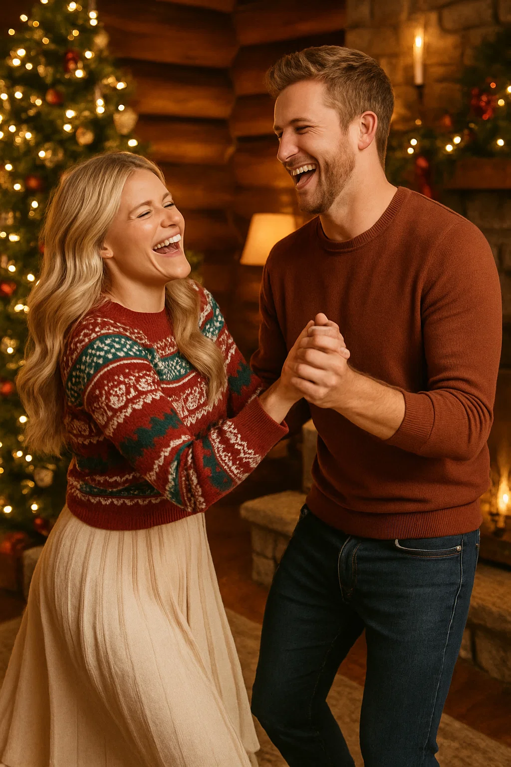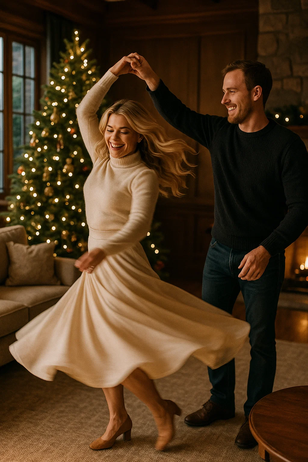 Carson crossed the room, gently reached for her hand, and whispered something soft that only she could hear. Witney laughed — that warm, unmistakable laugh — and without a second thought, she let him lead her toward the little space beside the fireplace. Someone had left a soft instrumental Christmas song playing in the background, a faint melody wrapped in nostalgia and warmth.