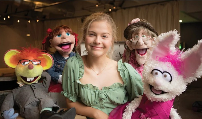 Just as the crowd caught its breath, the lights shifted again — this time to a Hogwarts backdrop. Out came Darci with another puppet: a bookish, wide-eyed brunette wearing robes and a Gryffindor tie.