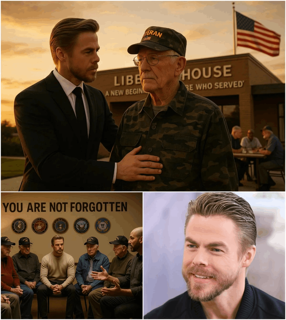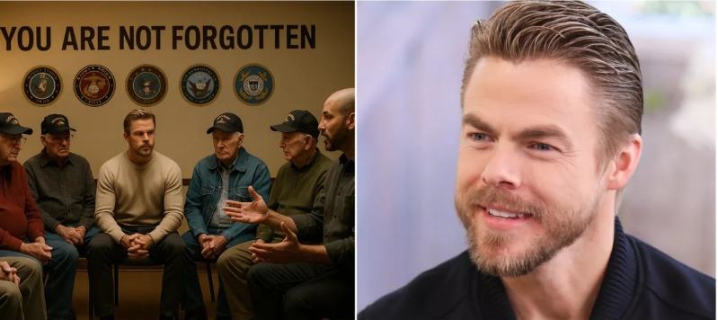 On a crisp morning filled with quiet reverence rather than spectacle, Derek Hough stood before a crowd of veterans, families, clinicians, civic leaders, and former service members whose lives had been shaped by war and, too often, forgotten by peace. There were no stage lights. No choreography. No applause cues. Just a flag moving gently in the wind and a building that represented something America has struggled to give its veterans for far too long: dignity, healing, and a way home.