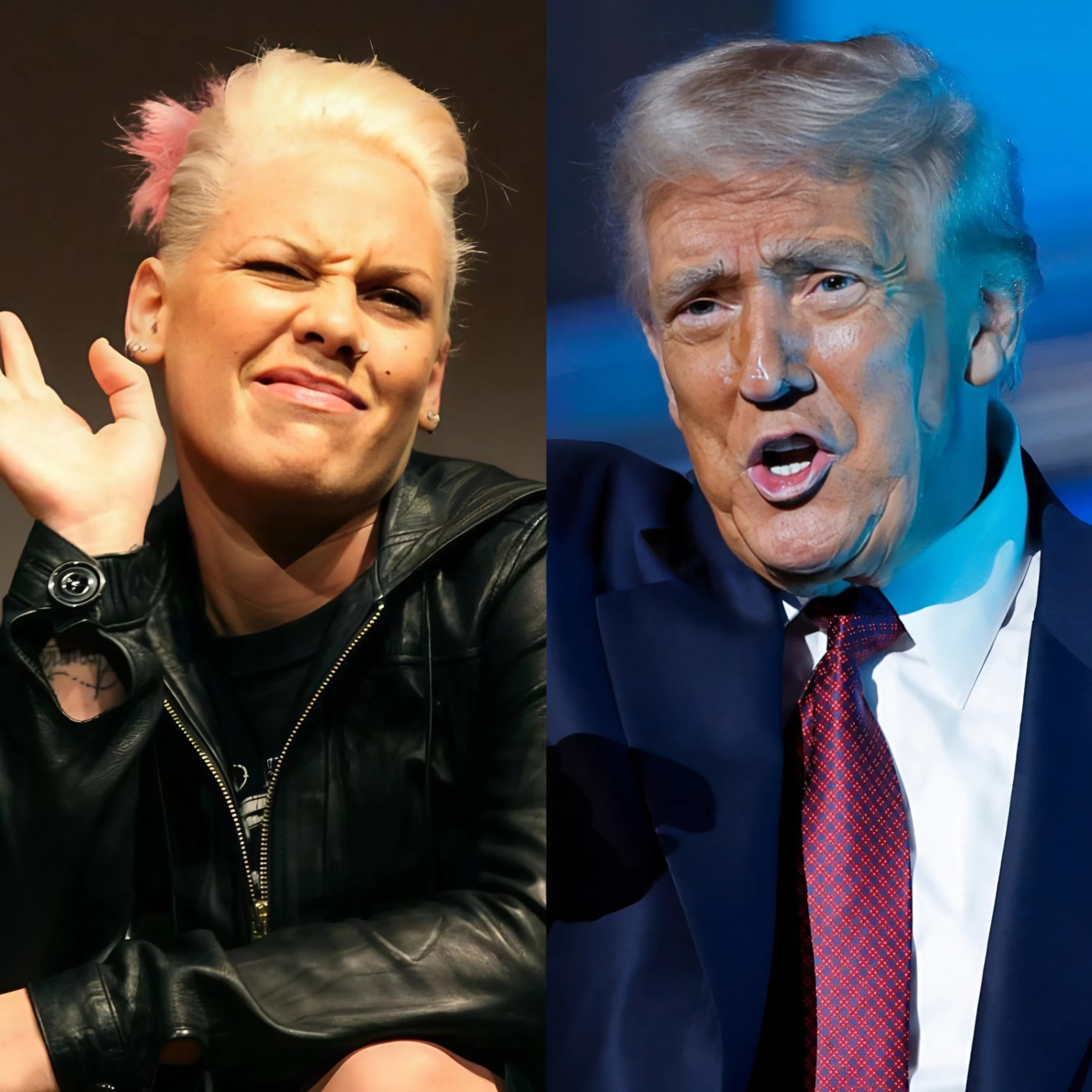 P!nk’s pause was the prelude to power, her silence a scalpel slicing through the sneer. She let the insult marinate, refusing the reactive retort that would’ve fed his fire. No flinch, no fidget—just a slow exhale, the kind she takes before a high-wire drop, her silver rings glinting like warning flares as she planted palms on the desk. The studio’s hum hushed to a heartbeat; remote viewers (peaking at 8.2 million) leaned into screens, the moment metastasizing into meme fodder mid-breath. Trump’s press-on only amplified the absurdity: “Sad! Your fans are moving on—real stars build walls, not whine.” But P!nk’s gaze never wavered, a storm behind sapphire eyes, channeling the grit that birthed “So What” from her own 2008 marital maelstrom. Then, leaning forward like a lioness uncoiling, she unleashed: “YOU DO NOT SPEAK FOR ME.” The words weren’t yelled—they were etched, low and lethal, each syllable a stake in the heart of his hubris. The screen glitched as if scorched; Trump’s mouth opened, closed, grin fracturing into a gape. The theater? Tomb-silent, the weight of witness heavier than any whoop.