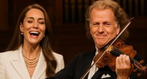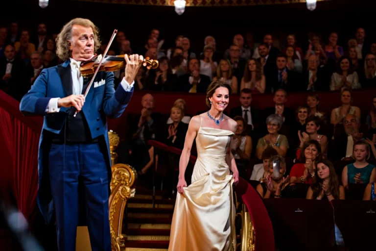 The atmosphere shifted. Whispers rippled through the hall, but no one dared break the spell. Catherine moved with the unhurried grace of someone aware that every eye was upon her. When she reached the edge of the stage, Rieu turned toward her, his smile one of genuine warmth. Without words, he played on, letting the music speak.