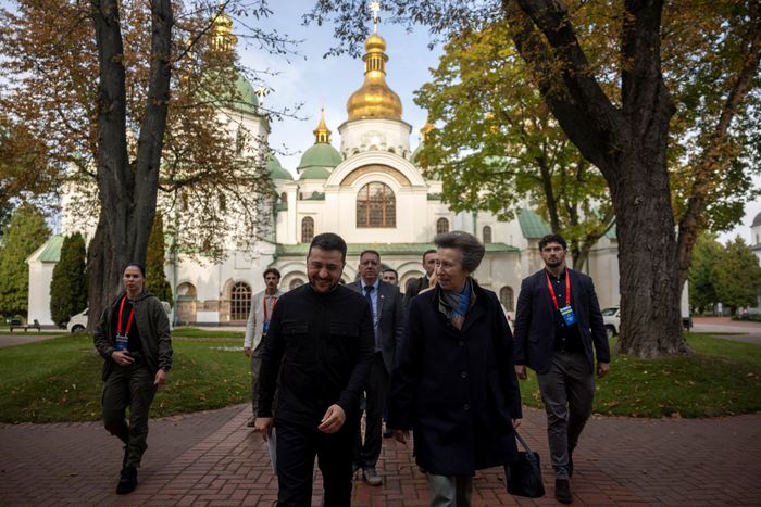 The Princess Royal walks with President Volodymyr Zelensky during a meeting at St. Sophiaโs Cathedral in Kyiv | PA