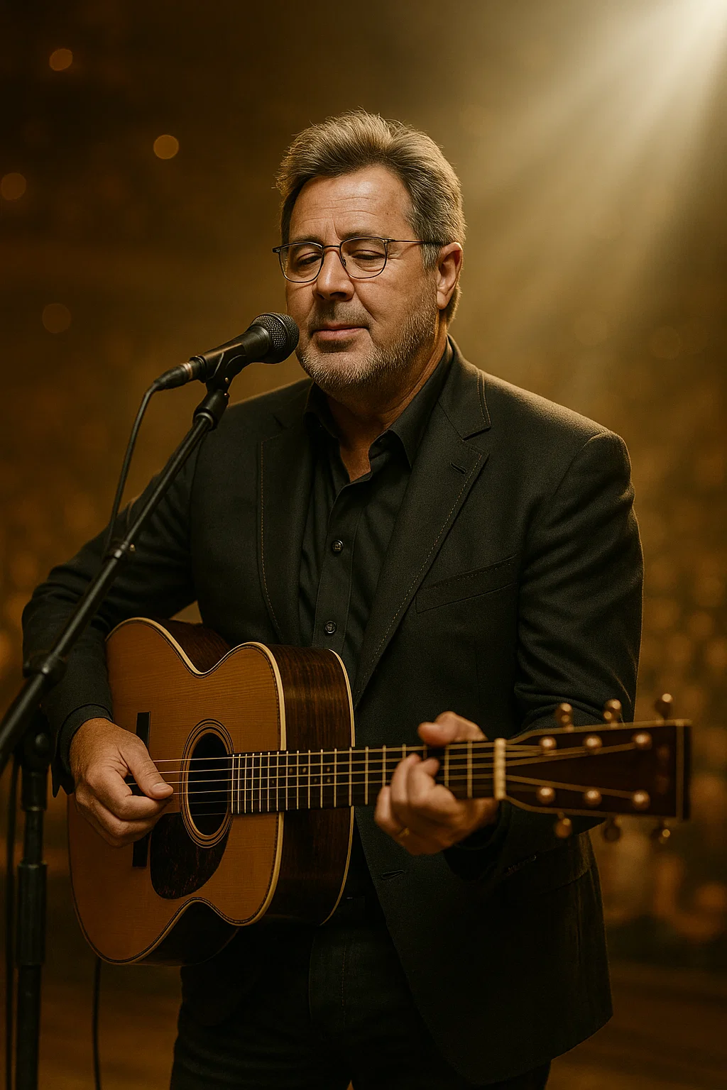 The lights dimmed to a single soft halo, and the Garden became a chapel. November 1, 2025, Vince Gill’s One More Time farewell tour, final night, sold out in minutes and now hushed to a whisper. No Eagles reunion, no bluegrass band, no 300-voice choir. Just Vince, 68, in worn jeans and a simple flannel, guitar resting on his knee, voice cracking like dawn over Tennessee hills. He inhaled, eyes closed, and let the first line of “Go Rest High on That Mountain” fall into the silence: “I know your life on earth was troubled…” No accompaniment. No safety net. Just a man and 40,000 hearts holding their breath.