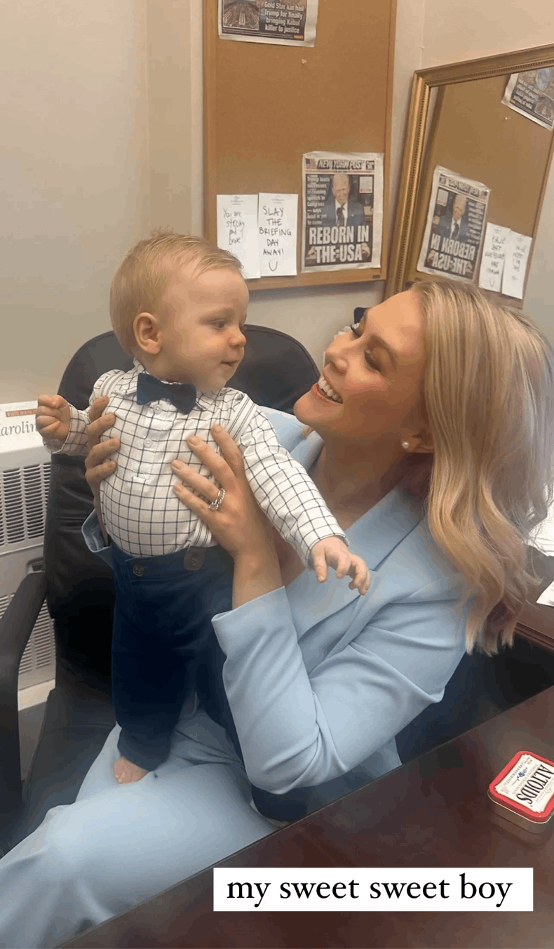 The Instagram carousel was captioned simply: “Visiting mama at work.” Another photo shared on her Instagram Story showed Leavitt cradling Niko in front of a desk and mirror, his reflection adding an extra touch of charm.
