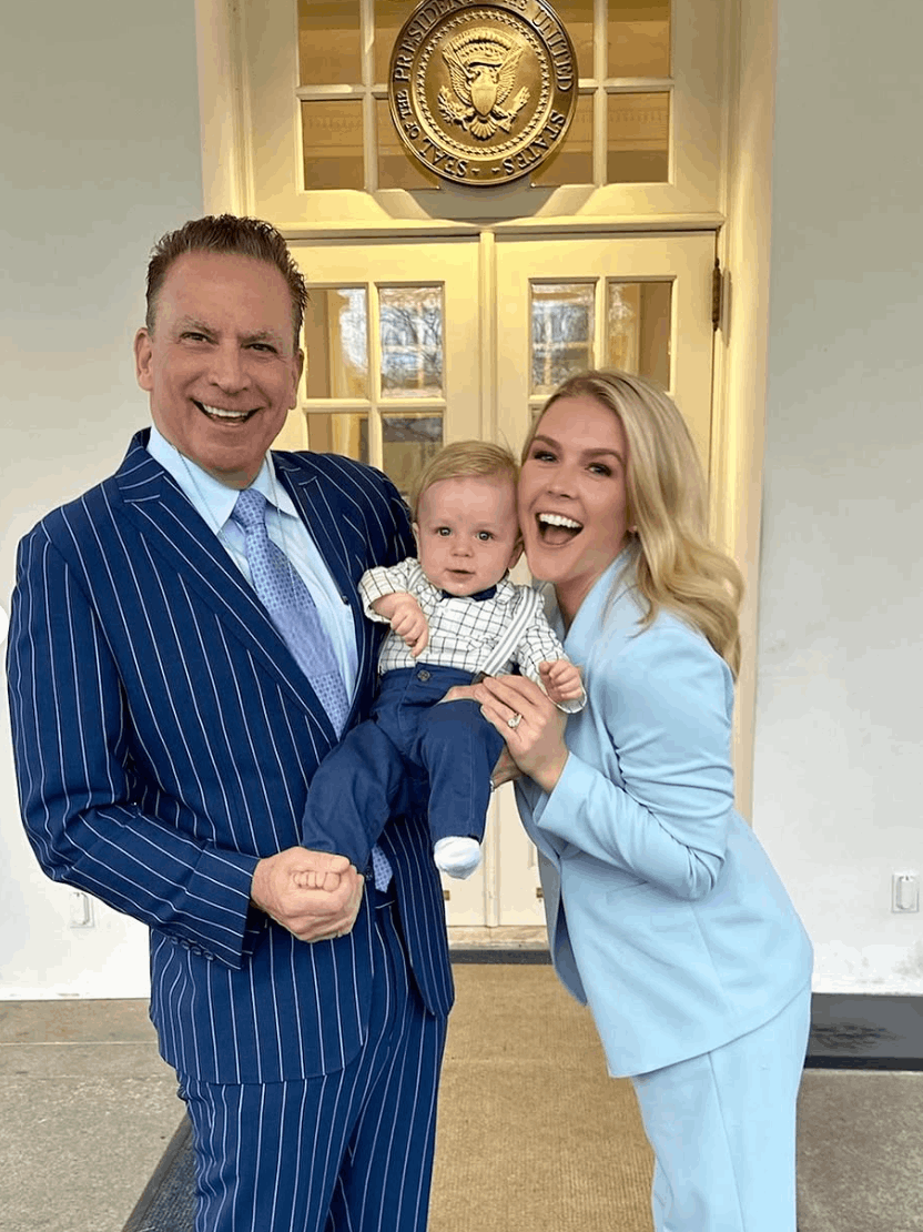Dressed in the same baby blue suit she wore during that day’s press briefing, Leavitt beamed as she held her baby and posed alongside Riccio, who wore a classic navy striped suit.